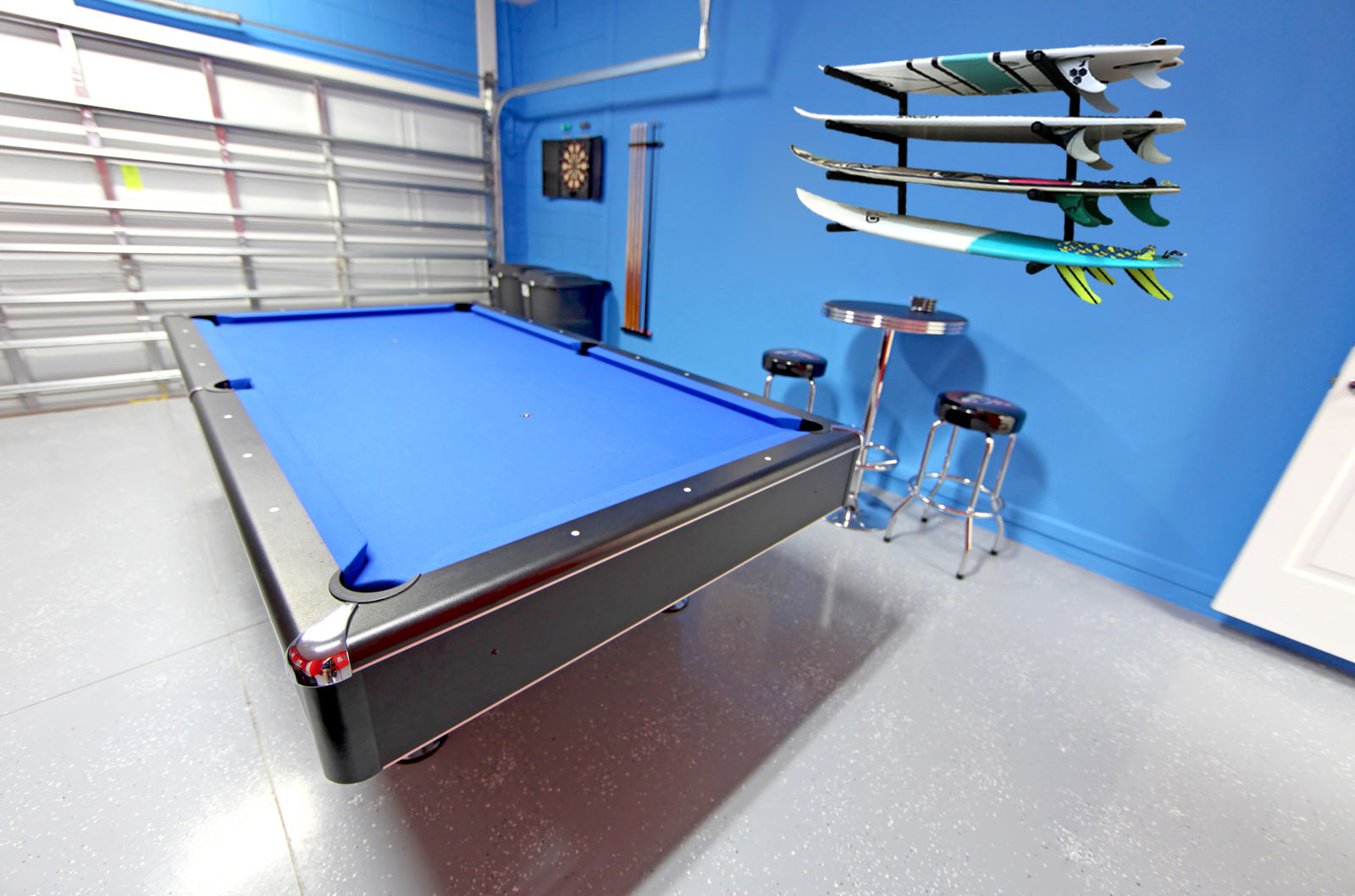 Wall mounted onto garage surfboard racks powder coated black to hold 4 surfboards or mal