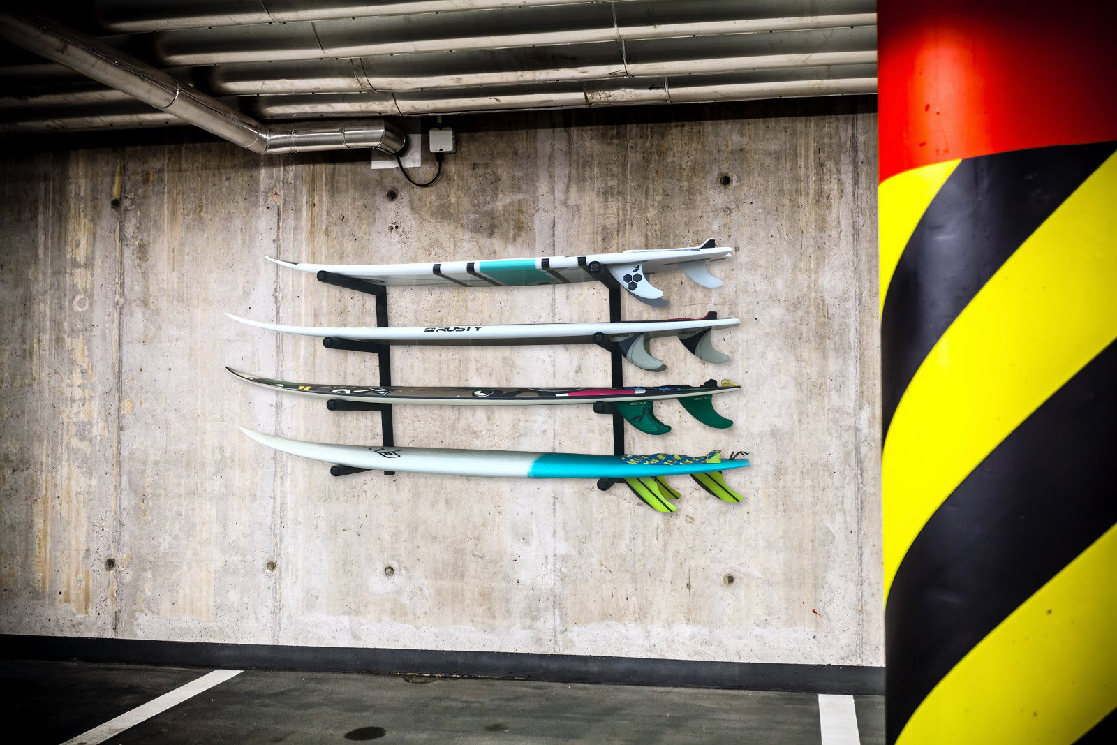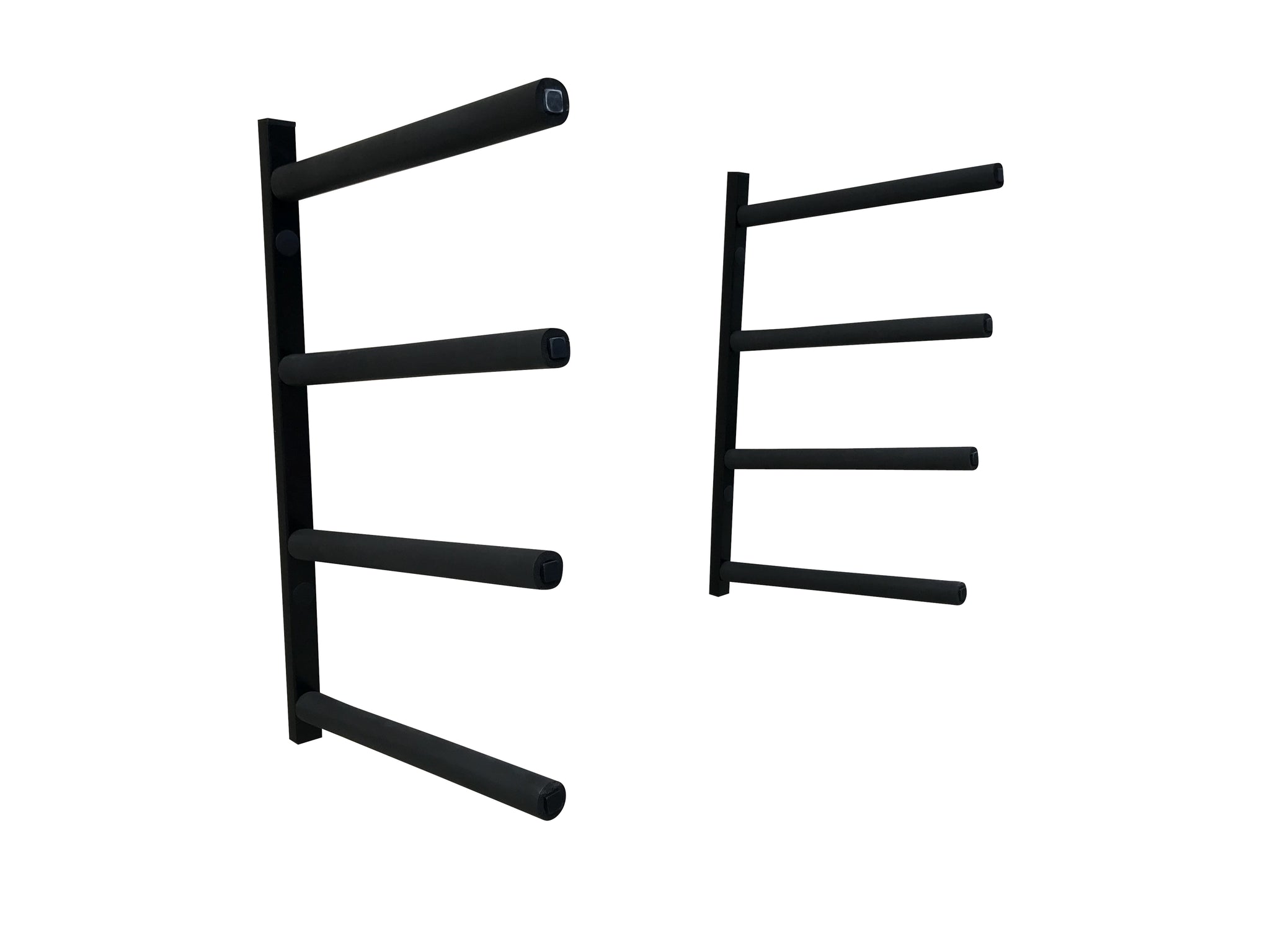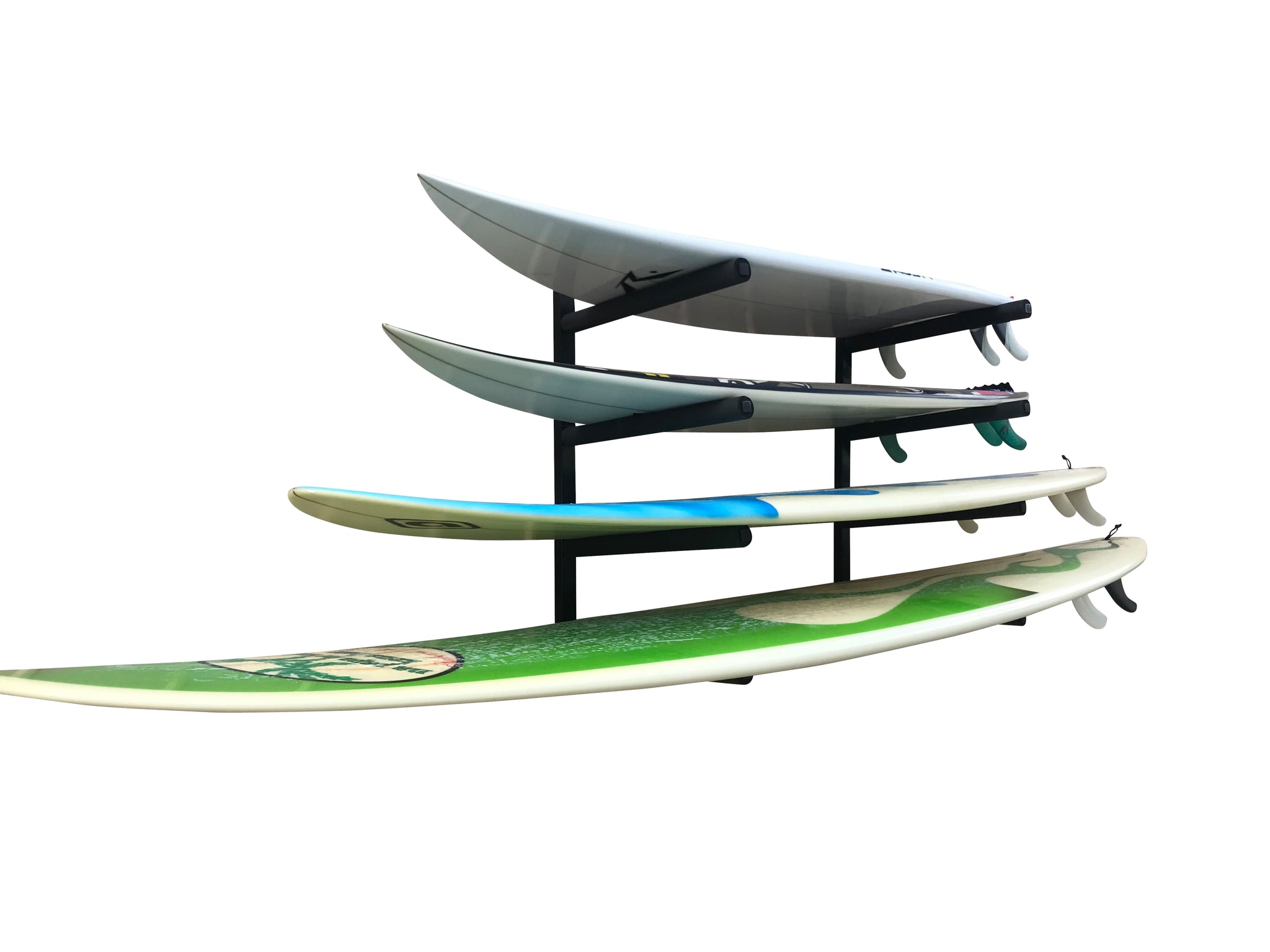 Wall mounted garage surfboard racks powder coated black to hold 4 surfboards or mal